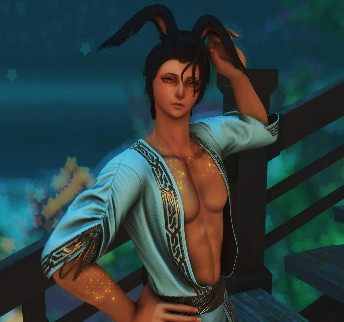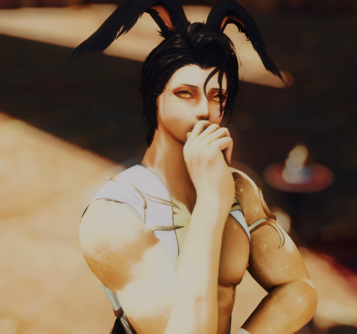 Very little is known about Xantris prior to his waking up from unconsciousness on a rock near Sheshenewezi Springs in Xak Tural, completely naked. The strange Viera could talk, but had no memories of anything prior to a flash of light and waking up. With eyes glinting like golden sunlight, small pieces of crystal lodged in his face and complete amnesia, nobody could provide answers; not that he seemed to mind. Almost immediately, he began to simply smile and offer his help to the locals.For several years, Xantris moved from community to community, offering his aid; no task too small nor great for the Viera, and soon enough any thoughts of his missing past were replaced by his present. Unburdened by the need for answers, he simply moved on and did what he could to help people across Tural, from aiding hunts to carrying parcels. Soon enough the locals stopped questioning his strangeness and simply welcomed him as one of them.When the attack on Tuliyollal came, Xantris was on his way towards the city, and in its aftermath, has been aiding recovery and rebuilding.